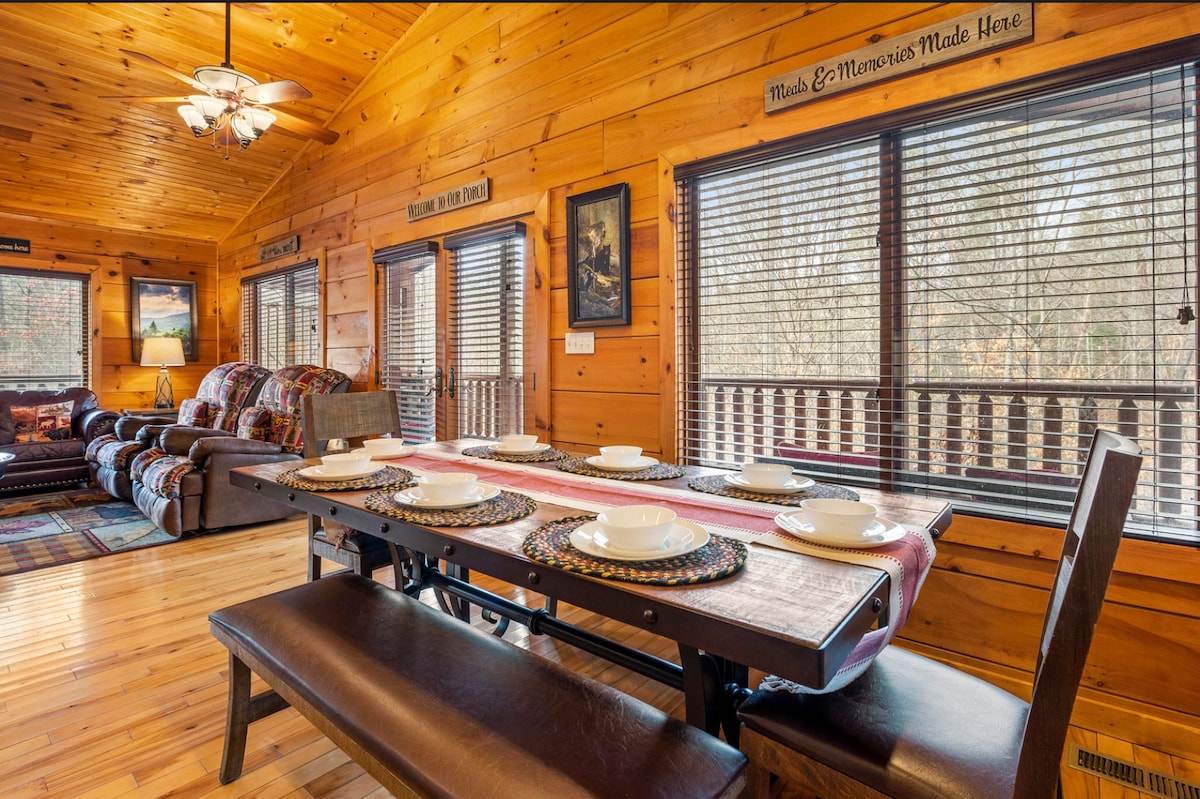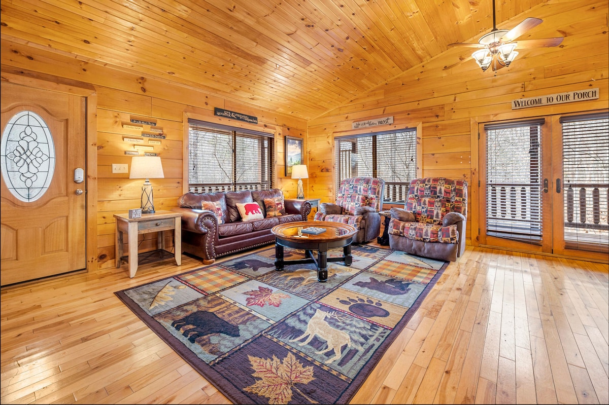 SeviervilleEscape to Sweet Seclusion by Hearth and Horizon Family Getaways - a cozy 3BR wooded cabin less than 10 minutes from Pigeon Forge and Dollywood. Enjoy a relaxing hot tub, evenings around the fire pit, and peaceful privacy on a full acre of tall trees. Pet-friendly, ranch layout, upgraded kitchen, large deck, Blackstone grill, and arcade games make this the perfect family getaway.